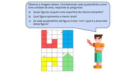 EF04MA21 - Medir, comparar e estimar área de figuras planas desenhadas em malha quadriculada, pela contagem dos quadradinhos ou de metades de quadradinho, reconhecendo que duas figuras com formatos diferentes podem ter a mesma medida de área.
